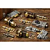 Lille og enkel cylinderlås med simpel regel mod højre og fremstående cylinder.