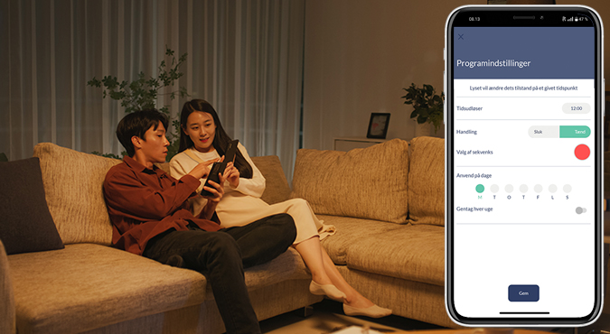 Ønsker du en endnu mere fleksibel styring af din smart belysning, kan du tilkøbe smart tilbehør (fjernbetjening, sensor eller afbryder), der kan tilføjes appen, og kobles sammen med de produkter den enkelte enhed skal styre. Du vælger altså helt selv, om du vil bruge fjernbetjening, afbryder, app eller stemmestyring til at kontrollere din Smart Home belysning.