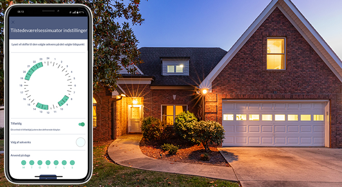 Anvend den praktiske tilstedeværelsessimulator til at beskytte dit hjem, når du ikke selv er tilstede. Variable tidsintervaller giver systemet mulighed for at tænde og slukke for lyset for at simulere din tilstedeværelse.