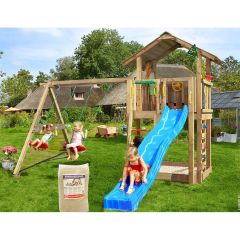 JUNGLE GYMJungle Gym legetårn Cubby m/klatremodul og gynger inkl. 120 kg sand trykimprægneret træ blå 440x400x305 cm6.919,00 kr. -